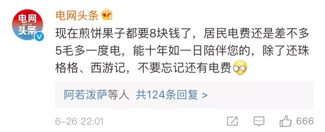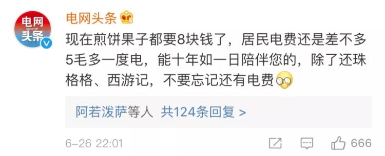 与此同时,国家电网及南方电网也前来科普。@电网头条 的回复是:现在煎饼果子都要8块钱了,居民电费还是差不多5毛多一度电,能十年如一日陪伴您的,除了还珠格格、西游记,不要忘记还有电费。