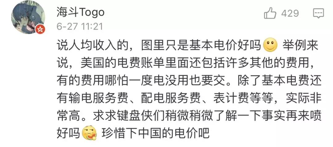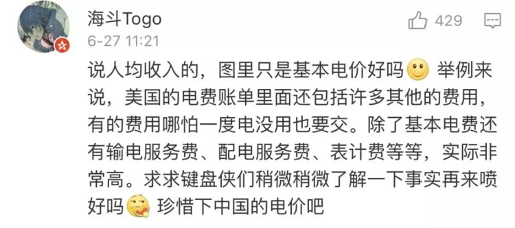 就在网友们纷纷留言点赞时,一位网友在这条微博下留言称,“电费能降到万恶的资本主义水平吗?”