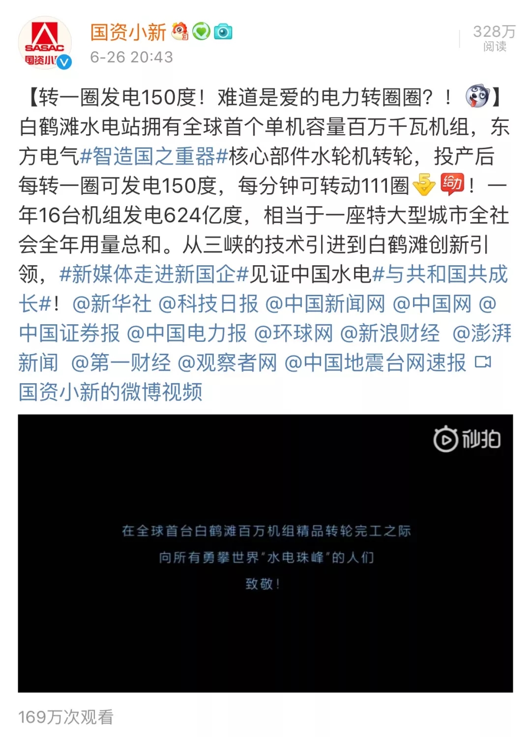6月26日晚,国务院国资委新闻中心官方微博@国资小新 发了一条微博,说的是白鹤滩水电站投产后每转一圈可发电150度,每分钟可转动111圈,一年16台机组发电624亿度,相当于一座特大型城市全社会全年用量总和。