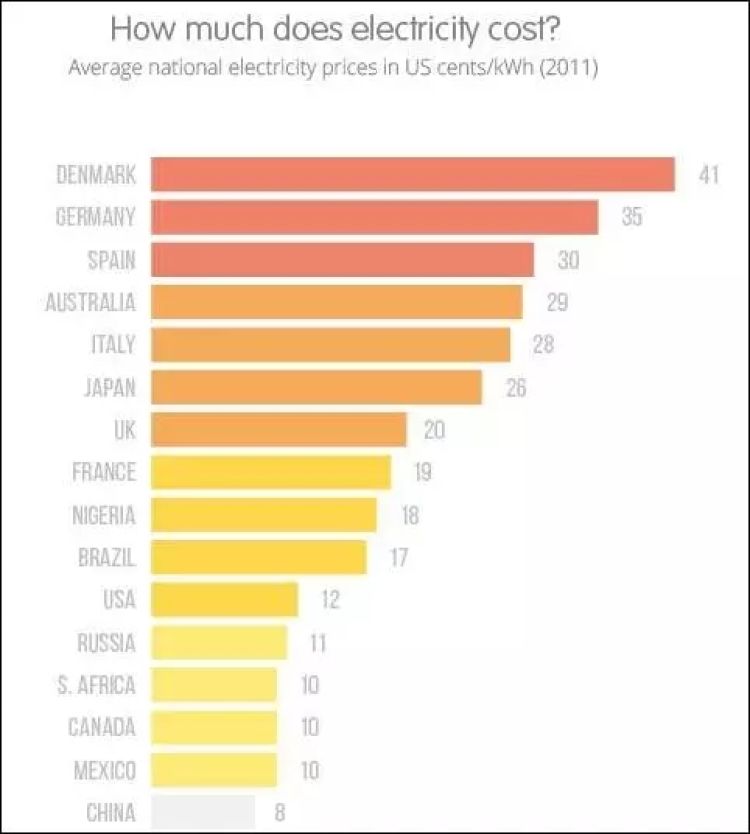 事实上,2011年,英国能源供应公司OVO Energy就曾专门对不同国家或地区的电价进行了相关调查,发现中国的电价维持在一个非常低的水平线: