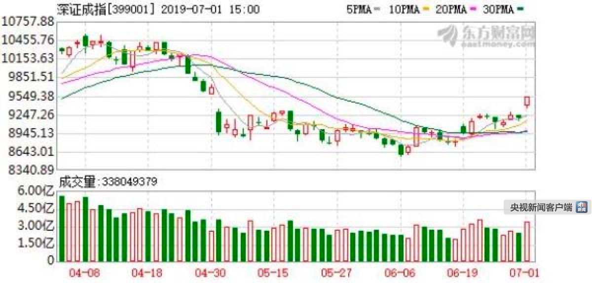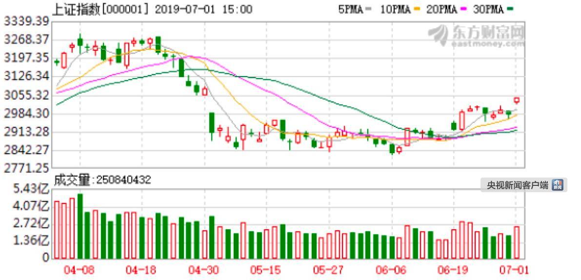 7月1日,沪深两市早盘集体高开,三大指数小幅承压后稳步上扬,以华为、OLED概念为首的科技股掀起涨停潮,沪指盘中大涨2%,创出本轮反弹新高,一度挑战前期缺口3052点,同时深成指和创业板指也涨超3%。午后各大股指维持高位窄幅震荡,量能逐步放大,两市超百股涨停。从板块上看,OLED、华为和5G等概念板块涨幅居前,仅黄金和稀土板块表现较弱。截至收盘,沪指涨2.22%,报收3044点;深成指涨3.84%,报收9530点;创业板指涨3.75%,报收1568点。(央视记者 沙千)
