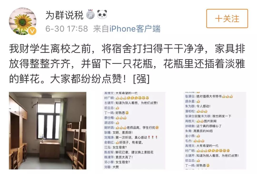 经济与管理学院陶勇老师在朋友圈里分享了照片并附上他的感言:“我财学生离校之前,将宿舍打扫得干干净净,家具排放得整整齐齐,并留下一只花瓶,花瓶里还插着淡雅的鲜花。细微之处见素质,为你们骄傲,高素质的90后。因为有你们,中国的未来会越来越好!”