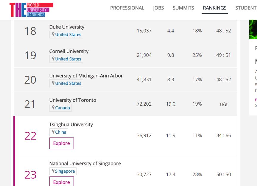 在去年9月公布的2019年泰晤士高等教育世界大学排行榜中,有72所中国大学上榜,比2018年的63增加了9所,这使中国成为全球排名第四的国家。其中,清华大学超过新加坡国立大学,成为排名最高的亚洲大学,在总榜中上升8位至第22位,是前30名中最大升幅。