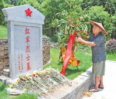 蒋石林在整理人们向红军墓敬献的鲜花。本报记者 刘佳华摄