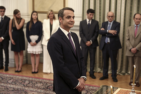 当地时间2019年7月8日,希腊雅典,当选总理米佐塔基斯宣誓就职。视觉中国 图