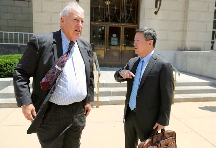 7月8日,在美国伊利诺伊州皮奥里亚,在量刑阶段开始前,华人律师王志东(右)与代表章莹颖家人的律师史蒂夫·贝克特(左)进行讨论。新华社记者汪平摄