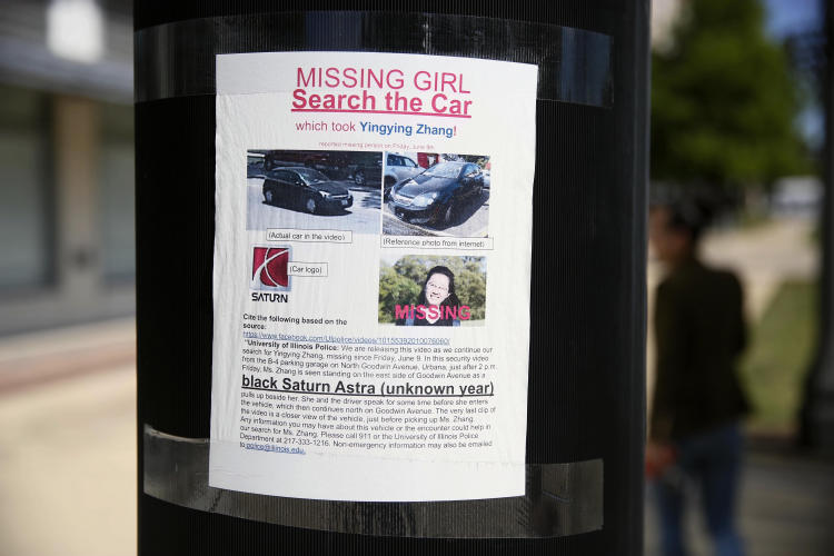 2017年7月1日,在美国伊利诺伊州中国访问学者章莹颖失踪地附近拍摄的寻人海报。新华社记者汪平摄
