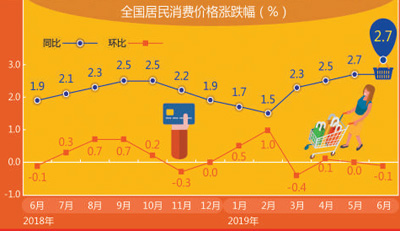 与去年相比,6月CPI同比上涨2.7%,食品价格上涨8.3%,影响CPI上涨约1.58个百分点;非食品价格上涨1.4%,影响CPI上涨约1.10个百分点。“据测算,在2.7%的同比涨幅中,去年价格变动的翘尾影响约为1.5个百分点,新涨价影响约为1.2个百分点。”董雅秀说。