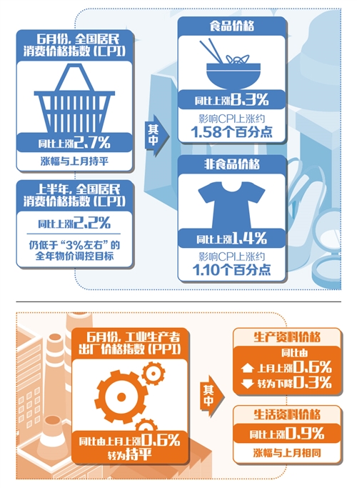 6月份,CPI同比上涨2.7%,涨幅与上月持平;PPI同比由上月上涨0.6%转为持平。专家分析认为,尽管CPI同比涨幅在二季度明显抬升,但上半年物价涨幅仍然低于全年物价调控目标,下半年CPI同比上涨空间有限,通胀压力并不明显,全年CPI同比涨幅突破3%的可能性较低。PPI则涨势走弱,可能出现阶段性负增长——