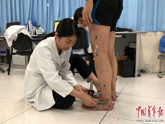 医生正在给患者测量脚踝宽度,为三维步态测试提供参考数据。刘昶荣/摄
