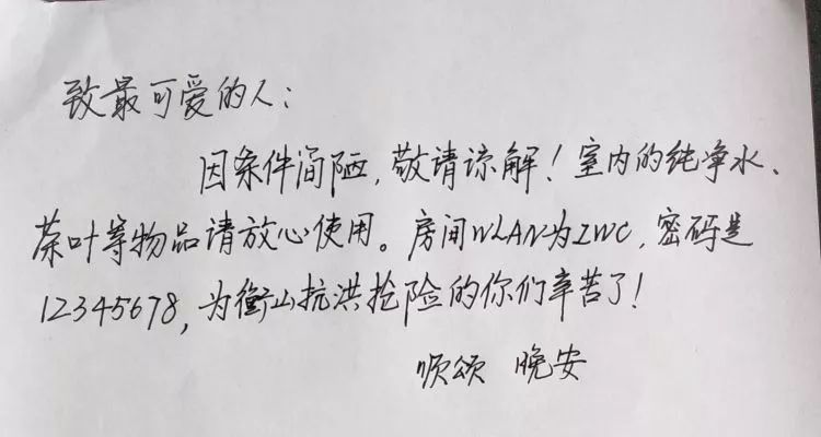 室内的纯净水、茶叶等物品请放心使用。房间WLAN为ZWC,密码是12345678,为衡山抗洪抢险的你们辛苦了!