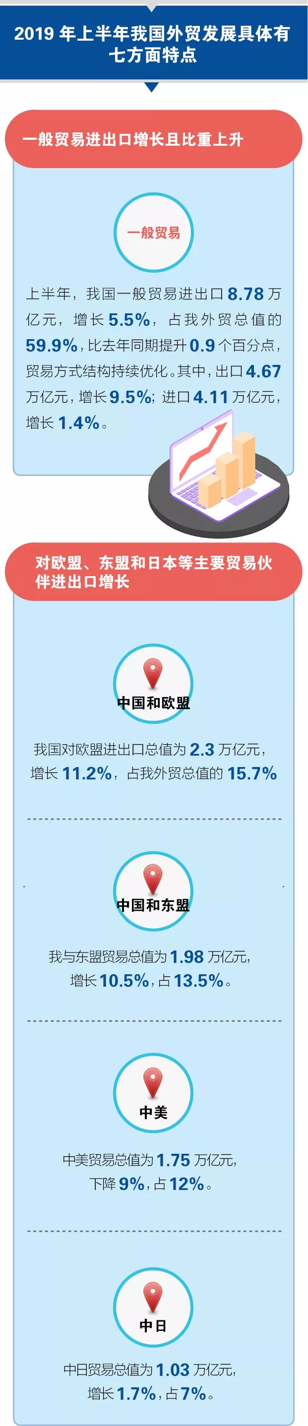 亮点一,贸易方式结构继续优化。上半年,产业链更长、附加值更高,更能代表自主发展能力的一般贸易进出口增长5.5%,所占比重较去年同期提升了0.9个百分点。值得一提的是,跨境电商等外贸新业态增势喜人,也给外贸增长提供了新动能。