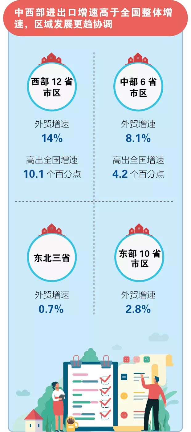 亮点三,区域外贸发展格局更趋优化拓展。近年来,中西部全方位开放进程加快,承接产业转移能力增强,对外贸易加快发展。上半年,西部12省区市和中部6省进出口分别增长了14%和8.1%,均明显高于整体进出口增速。京津冀3省市、长江经济带11省市进出口分别增长3.7%和4%。