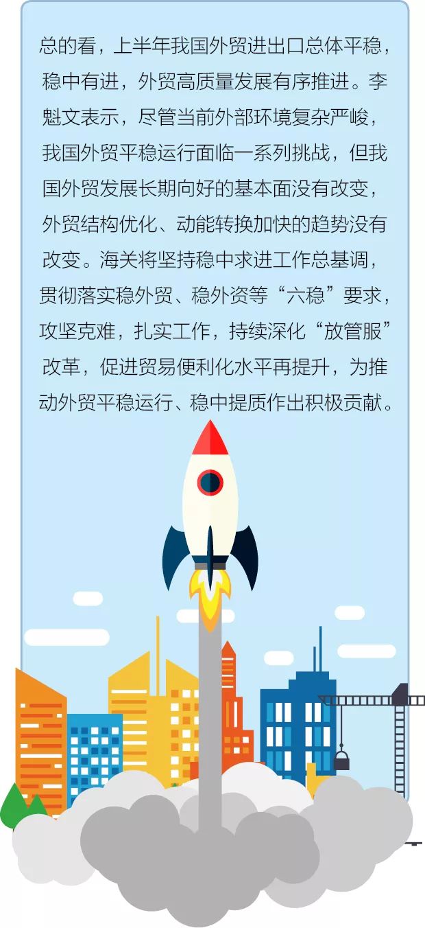 三是多元化出口市场开拓效果显著。上半年,民营企业占我国出口总额的50.6%,首次成为我国出口总额的半壁江山,对东盟、非洲、拉美等新兴市场分别增长19.3%、13.4%和9.9%,对“一带一路”沿线国家出口增长9.5%,出口市场更趋多元化。