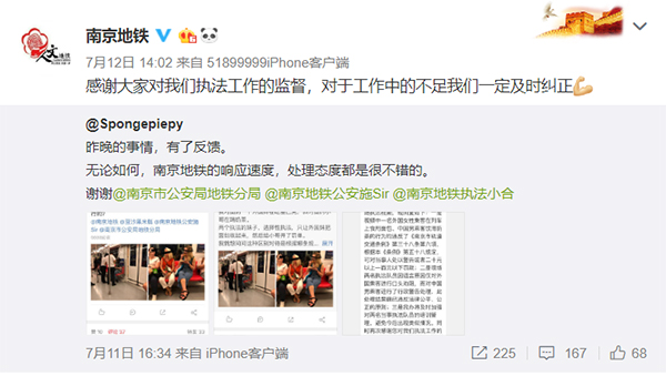 7月12日,南京地铁官方微博转发该名网友微博,感谢网友对其执法工作的监督,“对于工作中的不足我们一定及时纠正。”