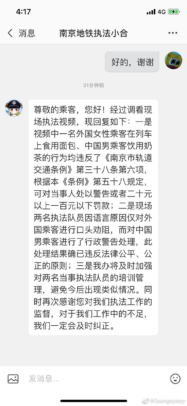 针对网友所反映,南京地铁对在车厢内饮食的乘客选择性执法,“只罚中国人不罚外国人”一事,南京地铁回应称,执法队员因语言原因,仅对外国乘客进行口头劝阻,而对中国男乘客进行了行政警告处理,确实已违反法律公平、公正的原则。