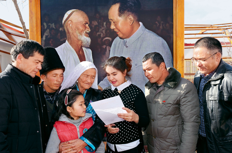 20世纪50年代,新疆于田县农民库尔班·吐鲁木受到毛泽东两次接见,人们亲切地称他为“库尔班大叔”。托乎提汗是库尔班的长女,她在给习近平总书记的信中表达了热爱祖国、热爱新疆、热爱家乡的愿望。2017年1月11日,习近平总书记回信,向她和家人及乡亲们送上祝福,并希望各族群众像石榴籽一样紧紧抱在一起,在党的领导下共同创造新疆更加美好的明天。图为2017年1月13日,托乎提汗一家人围在一起阅读习近平总书记的回信。 新疆日报社记者 宋君/摄