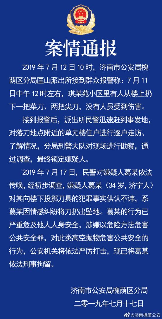 又有“高楼坠刀”自食其果:7月11日,山东济南一小区,高楼上“飞”下三把刀具,所幸无人员伤亡。济南市警方17日通报称,“高楼坠刀”是有人因情感纠纷向楼下投掷所致。