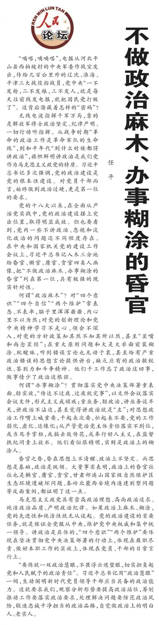 时刻新闻 —分享— 7月15日-18日,人民日报“任平”连续发声,对昏官、懒官、庸官、贪官四类问题干部进行了鞭辟入里的分析和批判,号召广大党员干部坚决贯彻落实习近平总书记的指示,践行新时代好干部标准。 来源:人民日报 编辑:秦舷