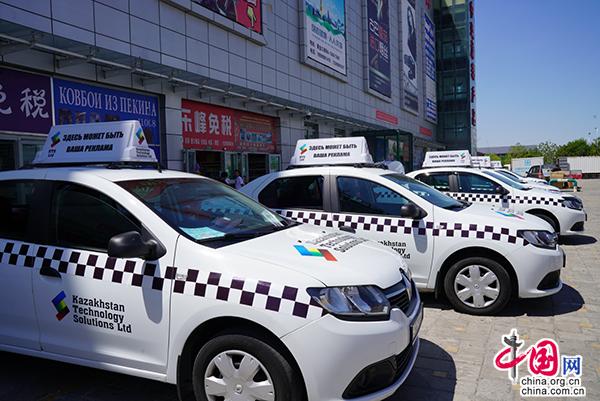 2019年6月28日,在中哈霍尔果斯国际边境合作中心,商铺外停放的哈萨克斯坦出租车。中国网记者 董小迪 摄