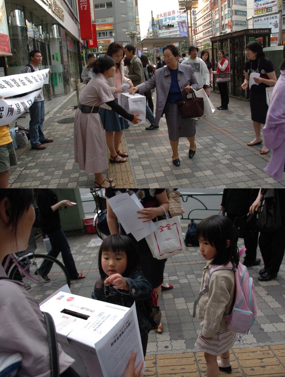 2008年5月,汉语角为汶川大地震在东京池袋车站前繁华地段募捐 。(照片由汉语角创办人段跃中提供)