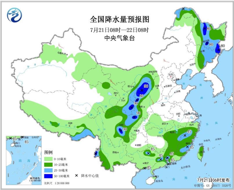 中央气象台预计,7月21日08时至22日08时,东北地区大部、内蒙古河套地区、西北地区东部、江南中东部、华南北部和中部、西南地区北部、云南西南部、西藏东南部等地部分地区有中到大雨,其中,内蒙古河套地区、黑龙江西北部和东南部、吉林东北部、甘肃东部和南部、陕西北部、四川盆地西南部等地部分地区有暴雨(50~90毫米)。
