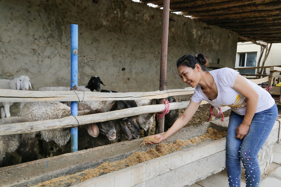 吾尼且木·艾山的儿媳米合日古丽·司马义正在给自家羊圈里的羊喂草饲料。