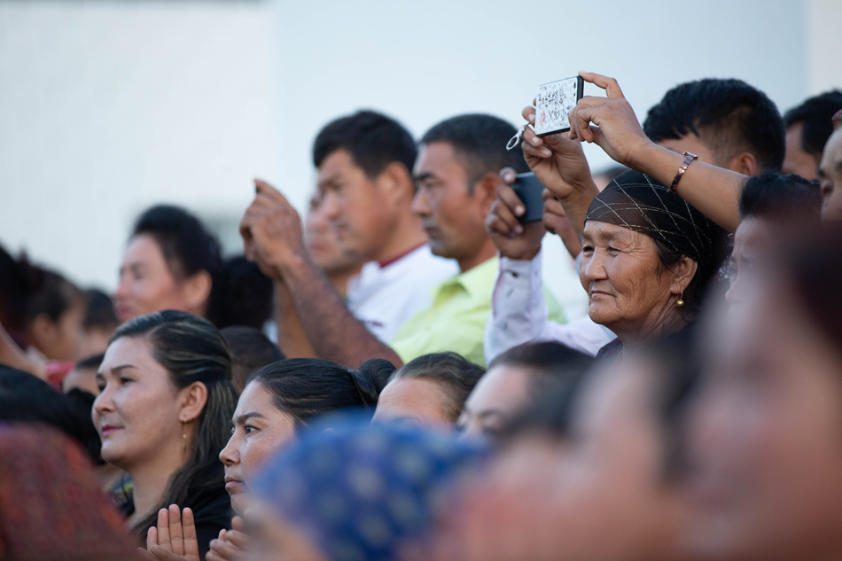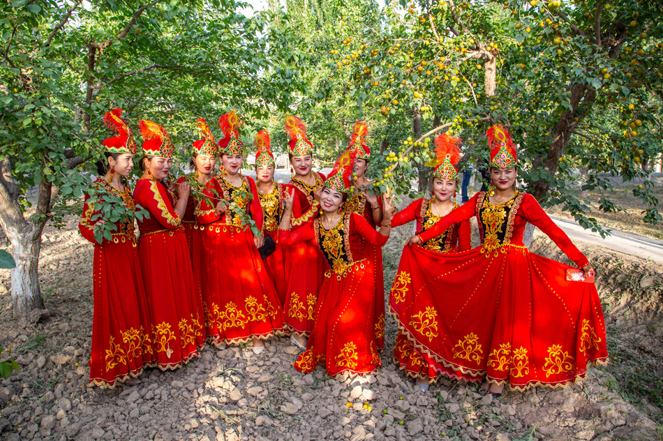 巴治州轮台县哈尔巴克乡卡西比西村,村民舞蹈队正在舞台边的果园里候场,当晚在村里的文化广场将会举行一场文艺演出。