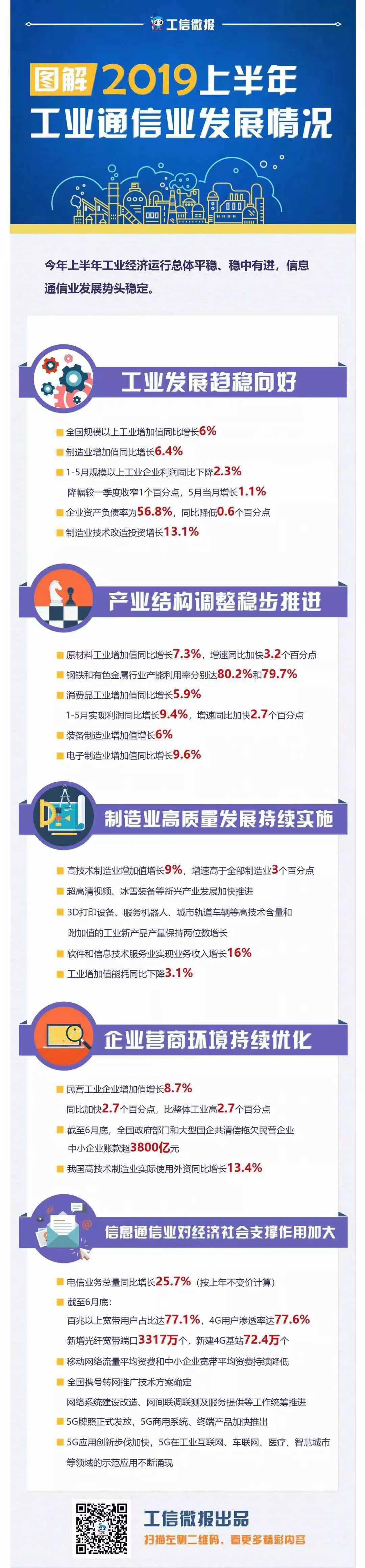 ——工业发展趋稳向好。一系列稳增长稳预期宏观调控政策加快落地生效,工业生产保持在合理区间。上半年全国规模以上工业增加值同比增长6%,处于全年增速预期目标上限。制造业增加值同比增长6.4%。企业效益下滑势头放缓。降低制造业增值税税率等降本减负政策效果明显,有力改善企业经济效益状况。1-5月份规模以上工业企业实现利润同比下降2.3%,降幅较一季度收窄1个百分点,5月当月增长1.1%。杠杆率持续下降,企业资产负债率为56.8%,同比降低0.6个百分点。技术改造和设备更新力度加大。实施新一轮重大技术改造升级工程,组织实施中央预算内投资技改专项,深入推进产融合作。上半年制造业技术改造投资增长13.1%,增速高于全部制造业投资10.1个百分点。