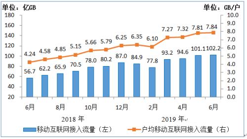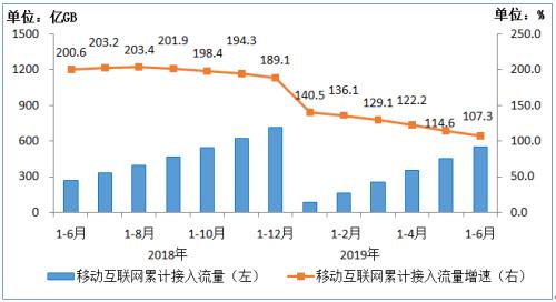 数据及互联网业务收入进入微增长通道。上半年,三家基础电信企业完成移动数据及互联网业务收入3086亿元,同比增长0.7%,增速较一季度和2018年全年分别回落1.5个和9.5个百分点,在电信业务收入中占45.9%,拉动电信业务收入增长0.34个百分点;完成固定数据及互联网业务收入1076亿元,同比增长2%,在电信业务收入中占16%,拉动电信业务收入增长0.31个百分点。