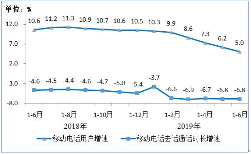 移动电话通话量降幅趋于平稳。上半年,移动电话去话通话时长完成11969亿分钟,同比下降6.8%,降幅较一季度和2018年全年分别扩大0.1和1.4个百分点;固定电话主叫通话时长完成614亿分钟,同比下降19.3%。
