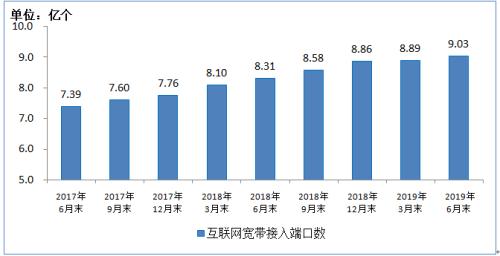通信能力方面,光纤端口占比稳步提升。截至6月底,全国互联网宽带接入端口数量达9.03亿个,同比增长8.6%,比上年末净增1776万个。其中,光纤接入(FTTH/O)端口达到8.13亿个,比上年末净增3317万个,占全部端口数的90%,占比较一季度和2018年全年分别提高0.8和2个百分点。xDSL端口比上年末净减651万个,总数下降至995万个,占比由上年末的1.9%降至1.1%。
