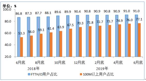 图3 2018年6月底-2019年6月底光纤接入(FTTH/O)和100Mbps及以上接入速率的固定互联网宽带接入用户占比情况