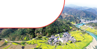 在位于安徽省歙县新安江两岸的新农村民居周围,油菜花处处开放,与远山近水交相辉映。