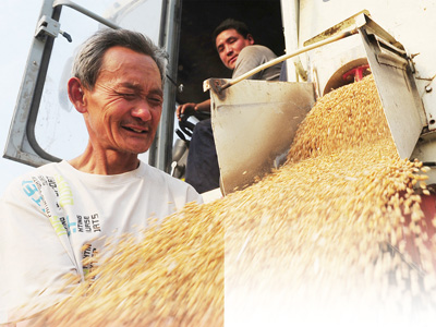 安徽省阜阳市颍州区西湖镇大沈庄农民沈俊彦望着大型联合收割机收获的丰收小麦喜上眉梢。