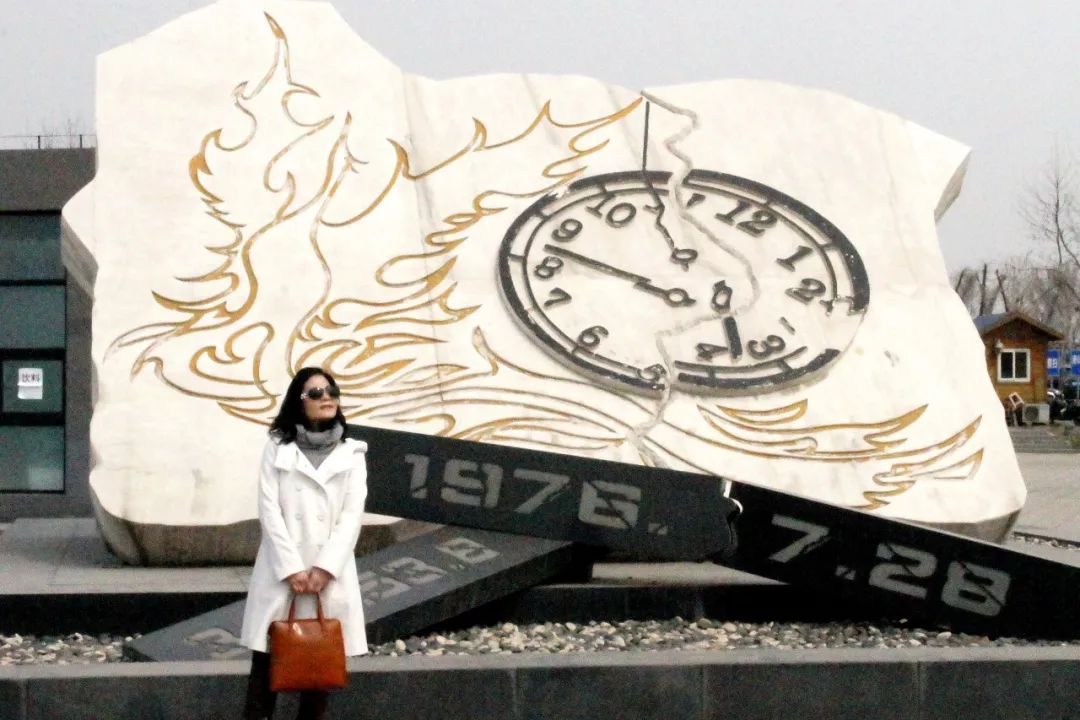 董惠娟在唐山地震遗址纪念公园入口与钟表雕塑的合影。新华社发