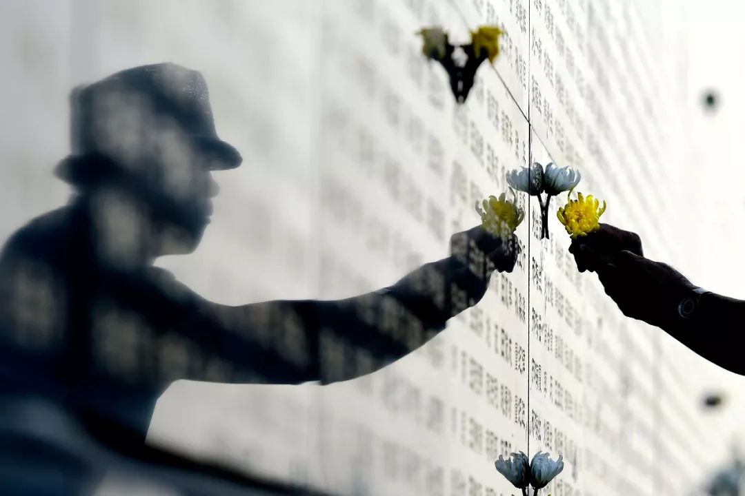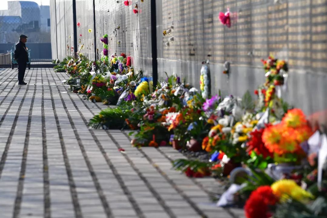 2018年7月28日,唐山大地震42周年纪念日,人们来到唐山大地震纪念墙前,摆放鲜花,祭奠亲人。新华社发(董钧 摄)