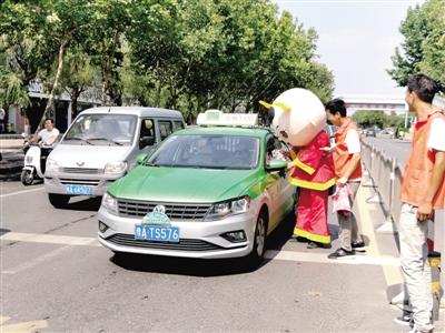 本报讯(郑报全媒体记者 张华 通讯员 毛文琴 文/图)“你好,感谢你的主动让行,这块毛巾送给你擦擦汗……”7月29日上午,一名身穿民族运动会吉祥物“中中”卡通造型服装的志愿者,在英才街郑州师范学院路口为礼让斑马线的司机点赞并送上毛巾等小礼物。