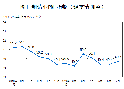 人民网北京7月31日电 (杨曦)国家统计局今日公布数据显示,2019年7月份,制造业PMI为49.7%,高于上月0.3个百分点,是今年4月份以来首次回升。非制造业商务活动指数为53.7%,比上月回落0.5个百分点,非制造业总体保持较快扩张。