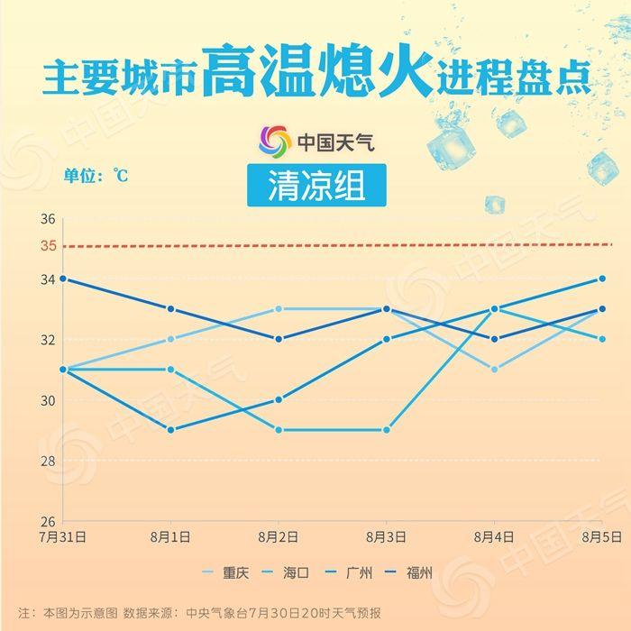 清凉组:重庆、海口、广州、福州未来六天最高气温都在35℃以下,广州明天的最高气温甚至只有29℃,可以说是夏日里难得的清凉了。不过需要提醒的是,华南地区的小伙伴们在享受清凉的同时,也要做好防台风的准备。