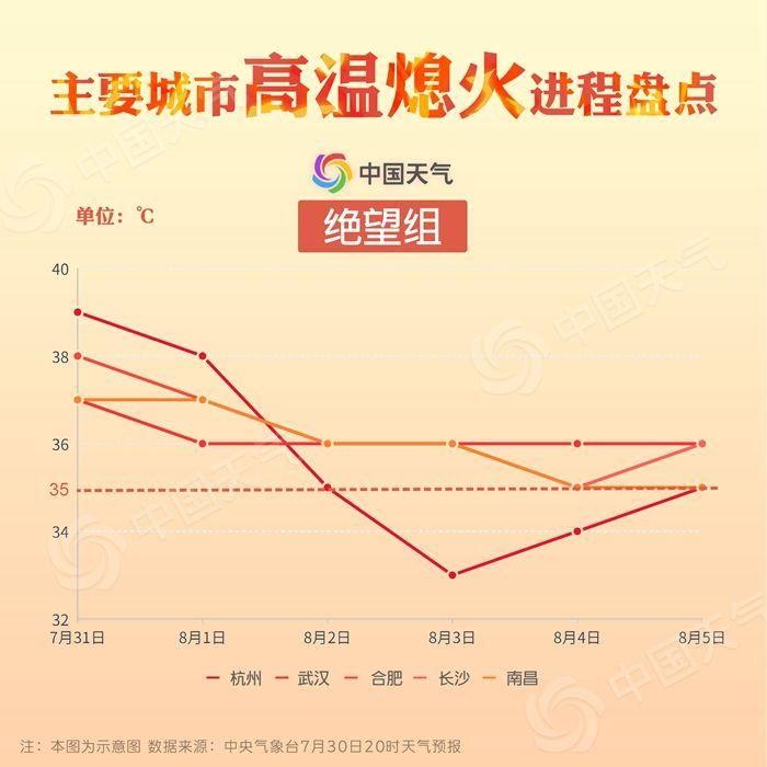 绝望组:对于杭州、武汉、合肥、长沙、南昌来说,未来的日子就有点绝望了。杭州7月下旬实现了高温的全满贯,进入8月,火力依然不减,虽然3日、4日有个短暂的缓解,但到了5日,高温又会卷土重来。而武汉、合肥、长沙、南昌就更惨了,连个喘息的机会都没有。