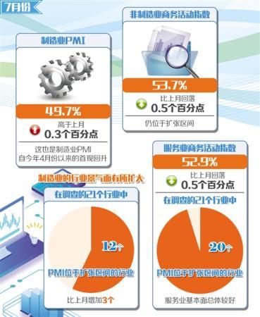 7月31日,国家统计局服务业调查中心和中国物流与采购联合会发布了中国采购经理指数。7月份,制造业采购经理指数(PMI)为49.7%,比上月提高0.3个百分点,景气水平有所回升;非制造业商务活动指数为53.7%,比上月回落0.5个百分点,仍位于扩张区间。