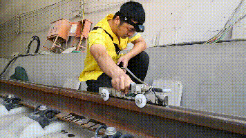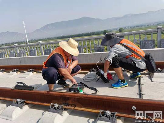 站在钢轨间,向前,是两条平行线,延伸到远方;向后,依然是两条线,望不到尽头。头顶上毒辣的太阳,像要把人射透照穿。采访前,记者本做好了心理预设,但依旧热得措手不及。明晃晃的太阳把钢轨晒得发烫,连同地上的碎石也变成了一块块热气袭人的“火山石”。这不,董立清还没开始作业就湿了衣服。上道前,身为工长的他开始布置作业任务,今天一早看了天气预报,天气过热,路上董立清一直琢磨着要不要在探测的钢轨上附上保护膜。