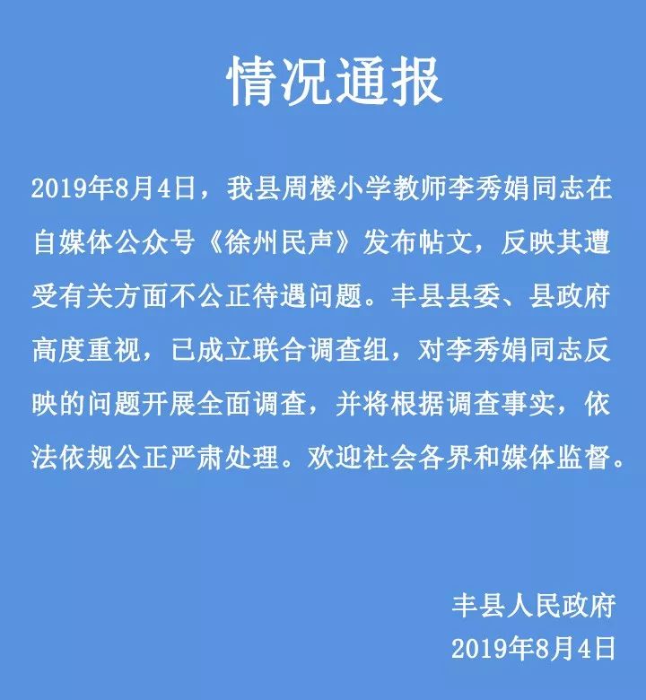 8月4日,江苏丰县周楼小学女教师李秀娟在网络发布求助信,李秀娟在信中说自己女儿左眼被同学无意伤害导致失明,她们一家曾欲带孩子前往北京医治,但当地将其行为定性为上访,并撤了孩子父亲的职务。李秀娟在信中透露出自杀倾向,表示自己“准备离开这个世界”。下午,丰县人民政府发布情况通报,称已对李秀娟反映的问题开展全面调查。下午16时许,有媒体从丰县县委办公室一工作人员处获悉,目前已收到派出所消息,两人已经找到,目前已经成立调查组介入调查,后续详细情况将进行通报,“人没事,在哪儿找到的不清楚。”