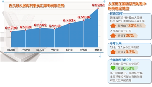 今年以来,人民币在国际货币体系中仍保持着稳定地位,人民币对一篮子货币是走强的,CFETS人民币汇率指数升值了0.3%。今年初至8月2日人民币对美元汇率中间价贬值0.53%,小于同期韩元、阿根廷比索、土耳其里拉等新兴市场货币对美元汇率的跌幅,是新兴市场货币中较为稳定的货币,且强于欧元、英镑等储备货币。