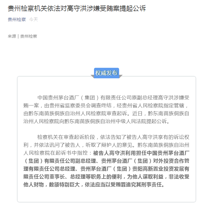通报称,中国贵州茅台酒厂(集团)有限责任公司原副总经理高守洪涉嫌受贿一案,由贵州省监察委员会调查终结,经贵州省人民检察院指定管辖,由黔东南苗族侗族自治州人民检察院审查起诉。近日,黔东南苗族侗族自治州人民检察院向黔东南苗族侗族自治州中级人民法院提起公诉。