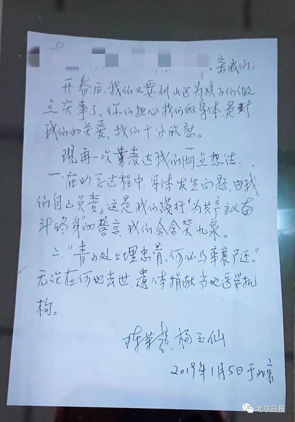 一封特殊的“遗嘱”心脏做过开胸手术,心衰肾衰,拖着“半条命”的陈荣超和老伴,现在最感迫切的就是时间。去年老两口到各个学校回访都是坐着轮椅去的。家人、单位都劝说他们不要再这么劳累,但他们却始终坚持。今年年初,陈荣超手书一封“遗嘱”,发给家人子女: “亲戚们:开春后,我们又要到山区为孩子们做点实事了。你们担心我们的身体,是对我们的关爱,我们十分欣慰。现再一次表达我们两点想法:一、在助学过程中,身体发生问题,由我们自己负责,这是我们践行‘为共产主义奋斗终身’的誓言,我们会含笑九泉。二、‘青山处处埋忠骨,何必马革裹尸还’,无论在何地去世,遗体捐献当地医学机构。 陈荣超、杨玉仙,2019年1月5日于北京”