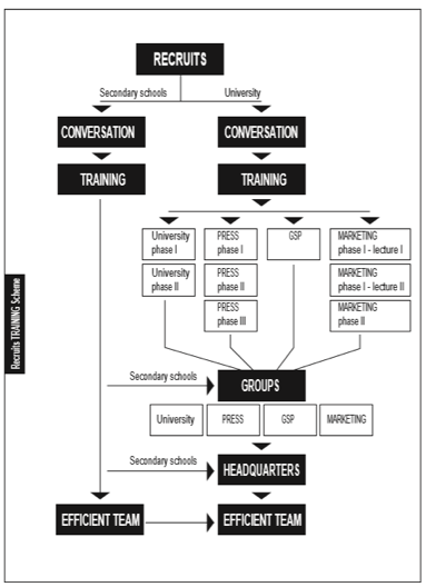 这些教程还包括模拟演练,学员被分成两组,一组演镇压,一组演游行。学员会提前训练队形、学会使用周围设备。这些学员会被分到不同的组,比如学生运动组、印刷组、支援组、营销组。
