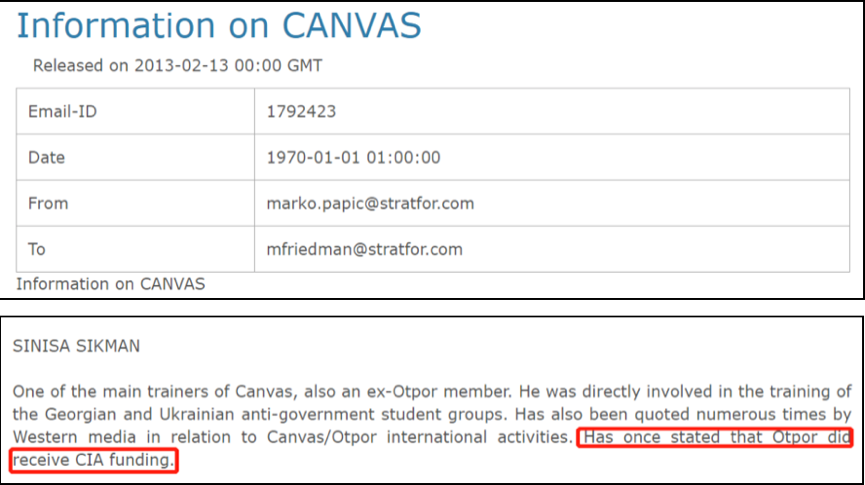 2013年,维基解密曝光了一封邮件。邮件显示,有一个叫CANVAS的学校收过美国中央情报局(CIA)的钱。这个CANVAS全称是非暴力行动和战略中心,是设立在塞尔维亚的一个培训机构。这一机构教当地反对派怎么搞游行、制作宣传海报,用“非暴力手段”去进行“民主运动”。