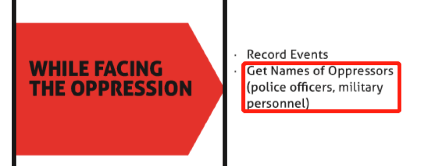 教程还有一章说:“当你遇到镇压,要记住军警的名字”。通过记下警察的个人信息,报复警察来瓦解他们的意志。在这次香港暴动里,就有人在网上人肉香港警察,散布警察的个人信息,号召大家去报复他和他的家人。
